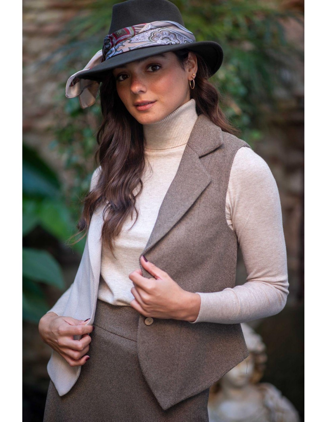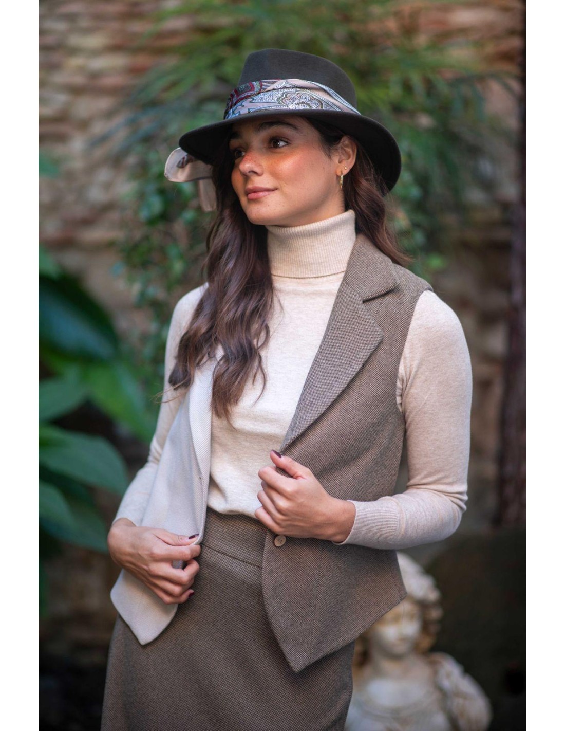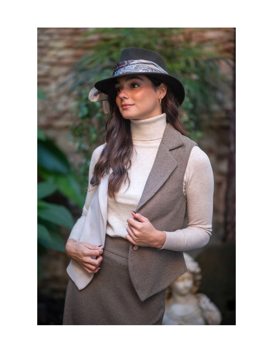 Chaleco sin mangas, con terminación a la altura de la cintura, solapa y corte ceñido al cuerpo, pensado para combinar con pantalones de tiro medio-alto. En la parte delantera presenta un diseño bicolor que combina beige y verde caqui, mientras que la parte trasera es completamente beige. Este chaleco es ideal para acompañar a nuestra falda oliva.