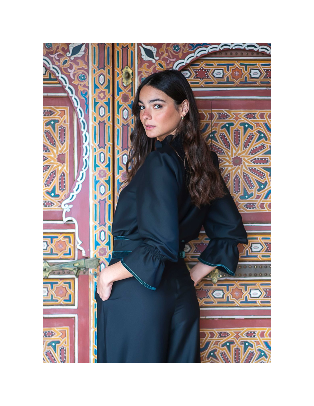 Camisa de sarga negra con escote en “V” profundo adornado con volante y filos en verde botella. Las mangas tres cuartos presentan un pequeño vuelo en el puño. El tejido tiene cuerpo y caída, lo que da una forma definida al diseño y permite un ajuste cómodo.