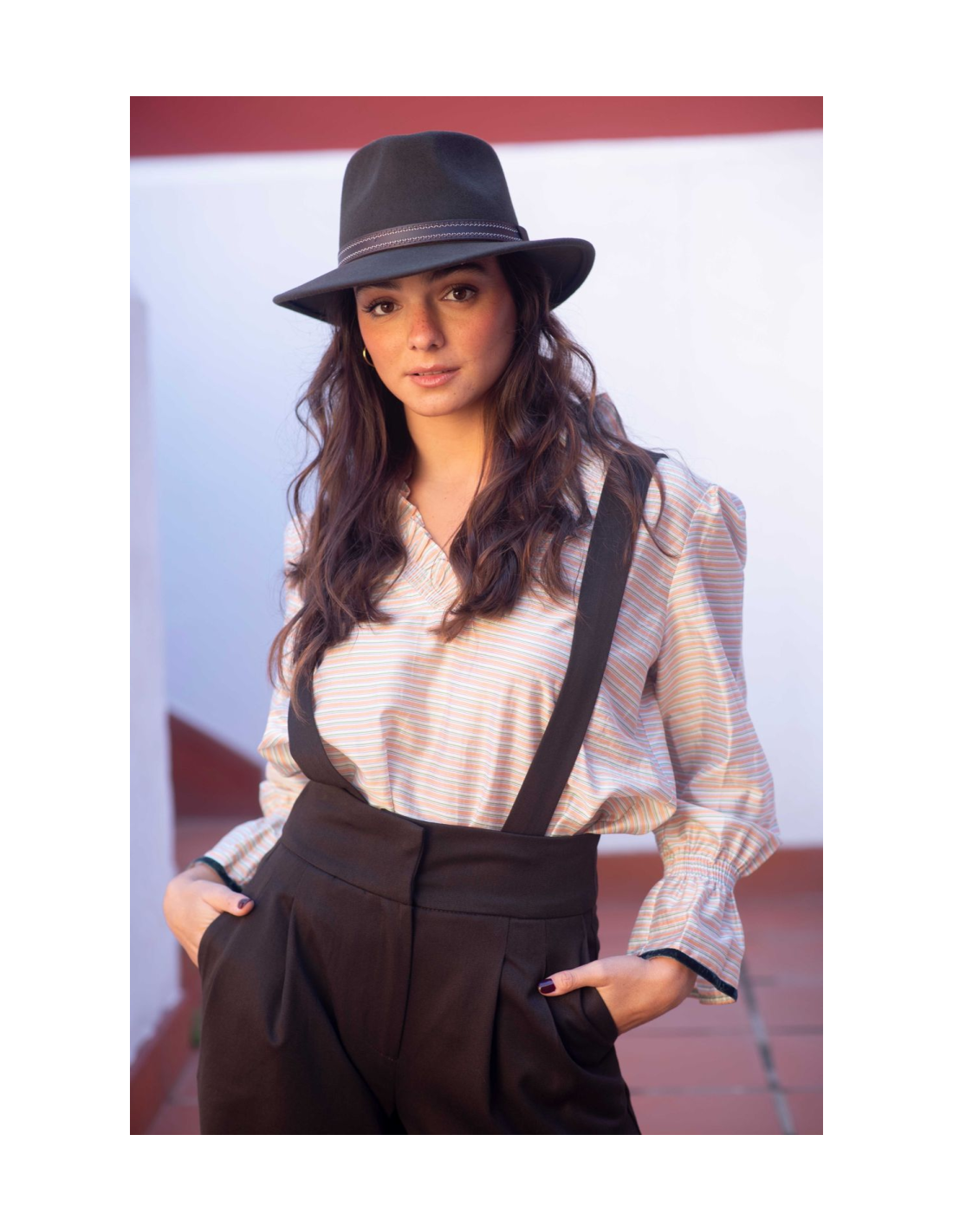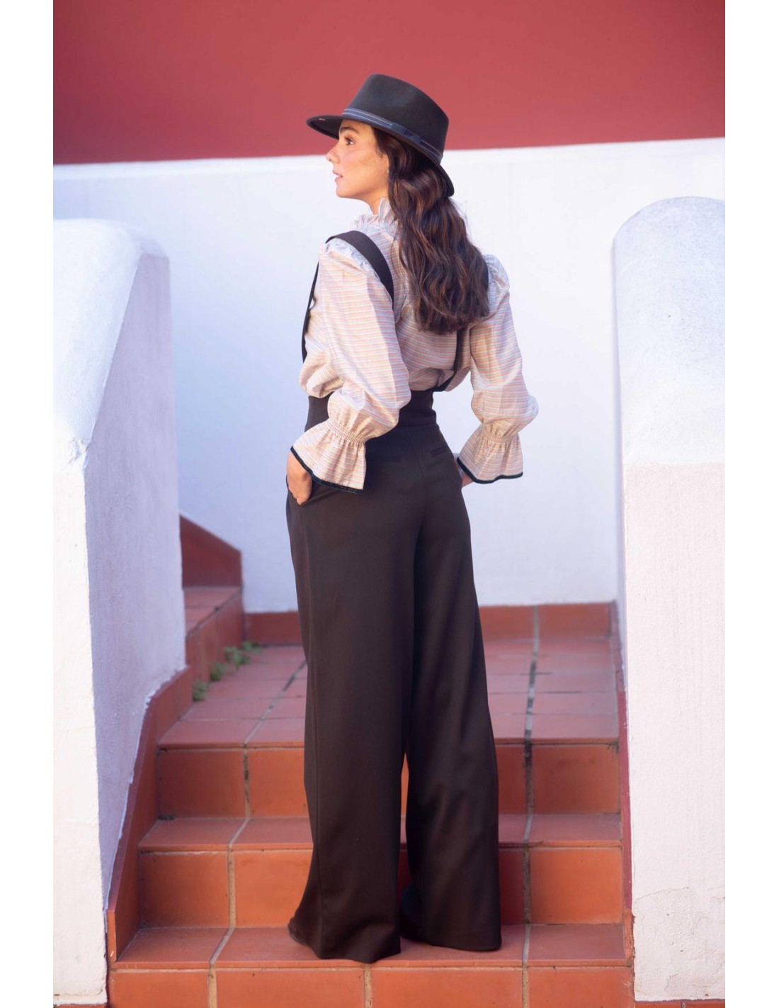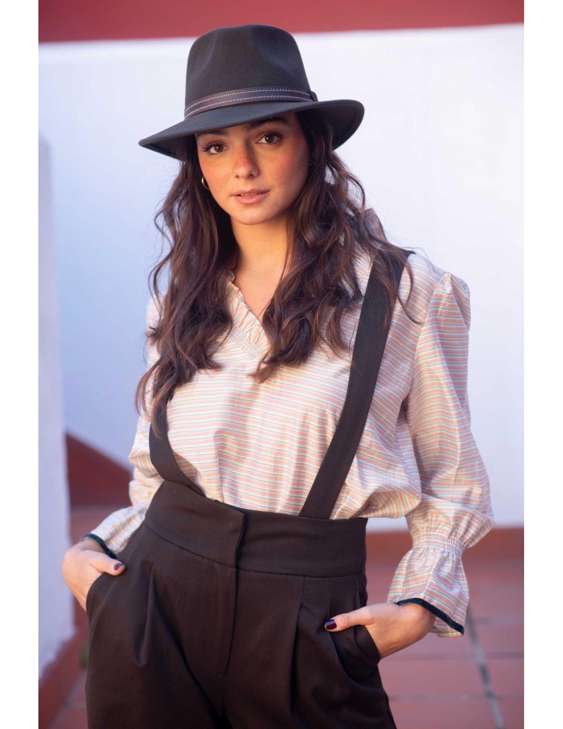 Camisa de rayas con escote en “V” y volante fruncido en el delantero. Las mangas son tres cuartos con terminación acampanada y un filo en verde botella que resalta los bordes. El tejido es ligero y con buena estructura, adecuada para combinar con prendas de vestir o más casuales.