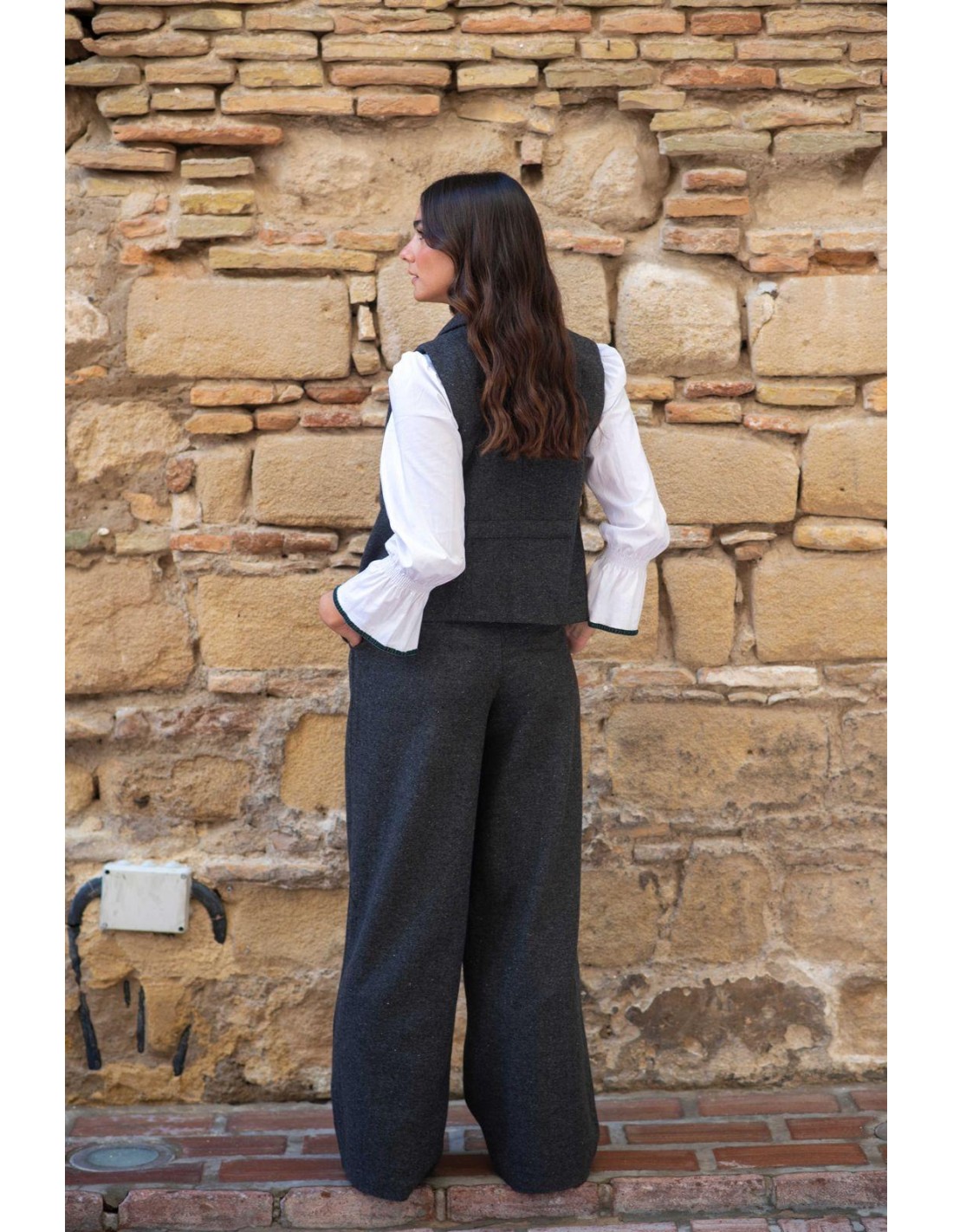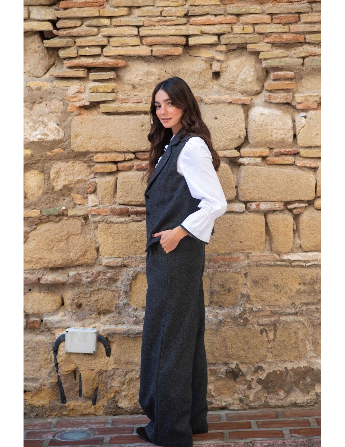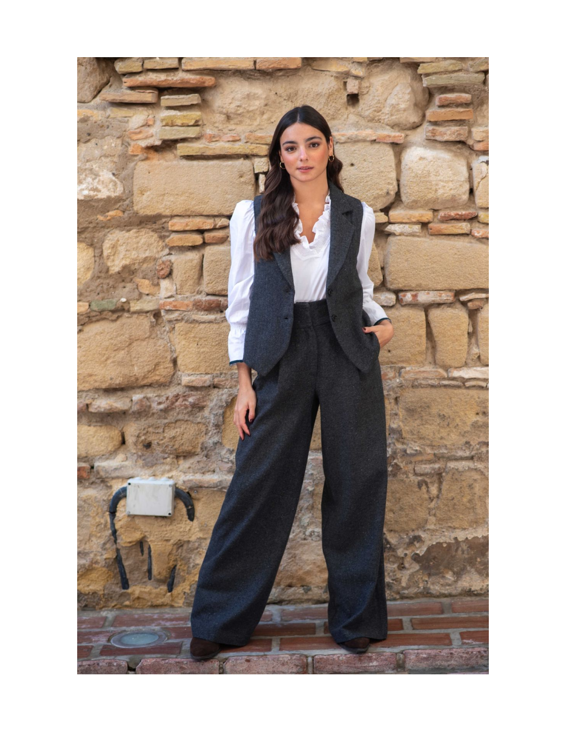 Chaleco sin mangas, con terminación a la altura de la cintura, solapa y ajuste entallado, concebido para coordinar con pantalones de tiro medio-alto. Confeccionado en tejido de abrigo de espiga en tonos gris y negro, de carácter consistente y estructurado. La solapa se remata con un vivo negro que aporta definición al diseño.